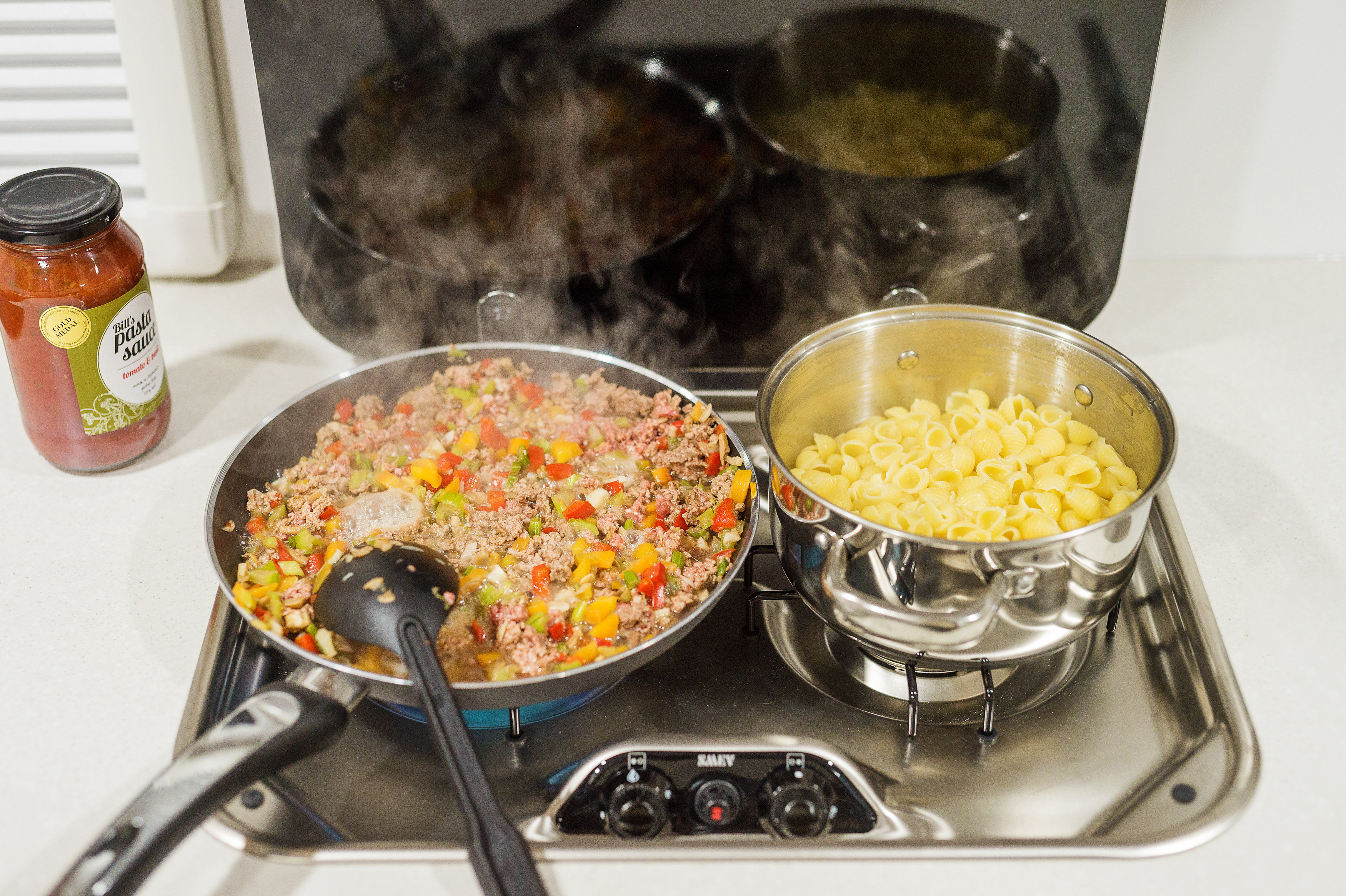 you have to do is find your pots from the cupboards, pour in the pasta,