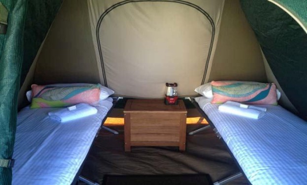 city lights. Here you can choose from mini glamping which consists of a pre-erected dome tent, two camp beds and two sun lounges or two bedroom glamping which is a great option for families and provides two tents, four camp beds with bedding and towels provided, table and chairs, lanterns and an esky.