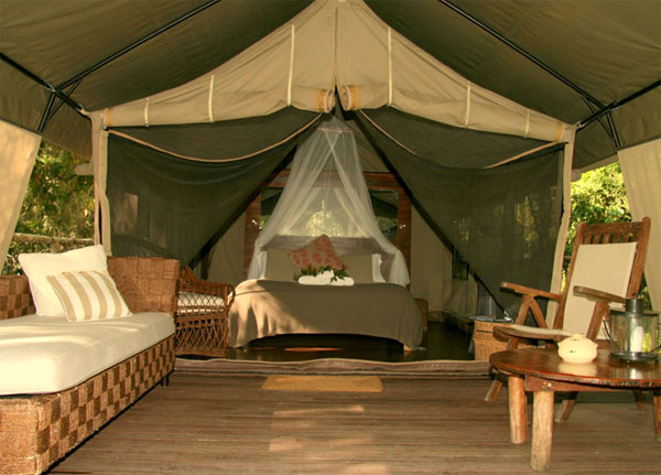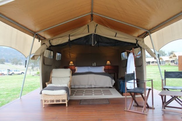 The tent is situated in a private forest setting, providing you with an immersed Australian camping experience. The tents boast hardwood floors, open showers, rock handbasins and a rotating wood fire. Enjoy the clear starry night sky from your front deck. You can sleep in the comfort of your tentâs king-size bed or in the traditional swag on the deck. Each tent provides organic toiletries, a camp kitchen, BBQ and gourmet delights in the mini bar.