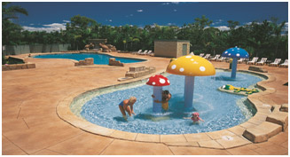 Inca themed pool complex with two salt-water swimming lagoons, an